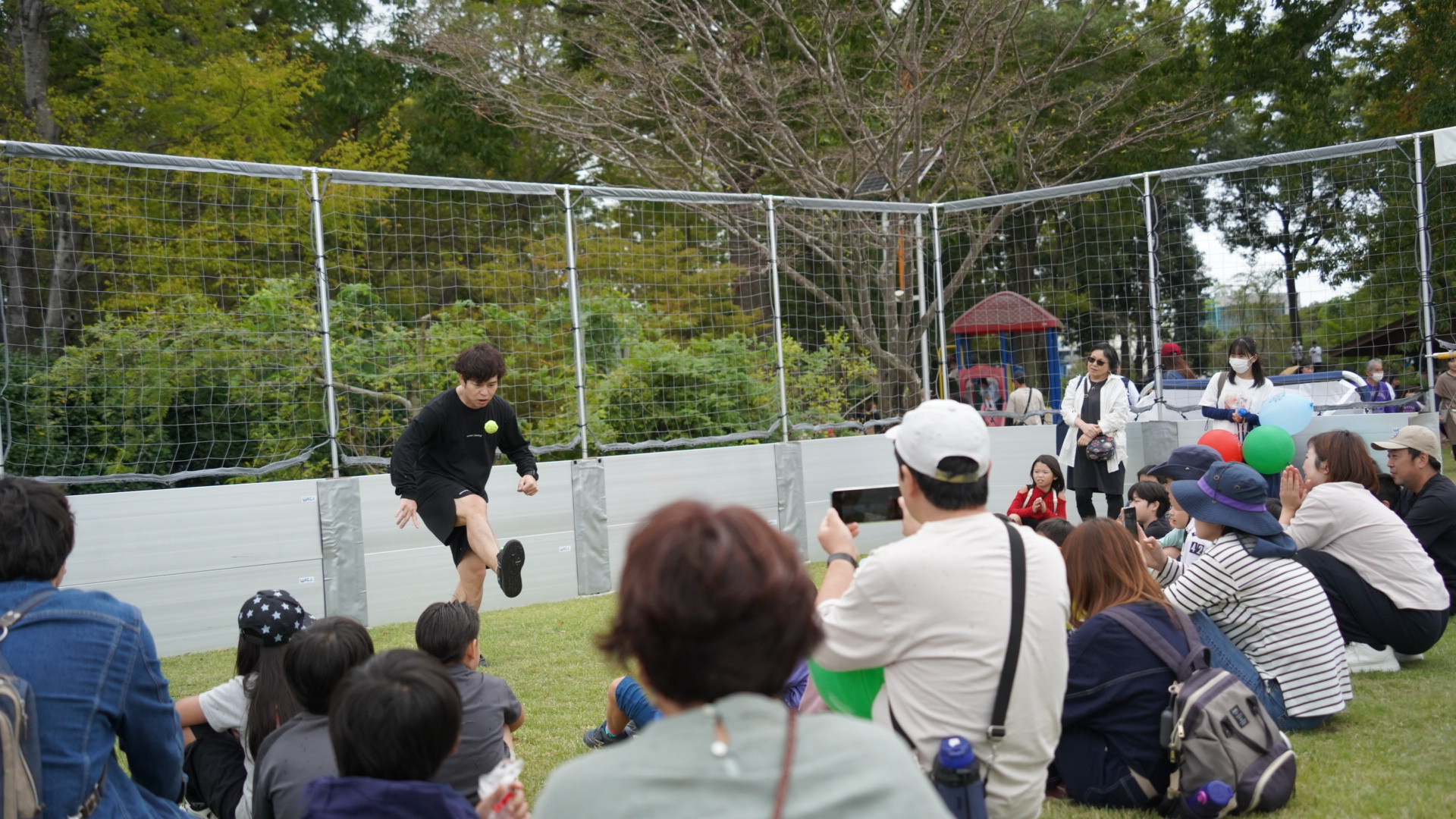 初めてフットバッグを見る方も多く、足技に驚いたり、楽しそうに見守ってくださる様子が印象的でした。